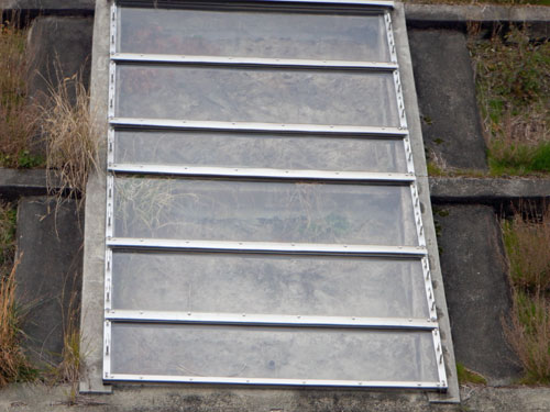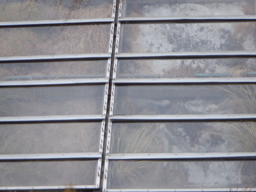 被爆当時の地層に至る階段から撮影しました。 手前の手すりは、被爆当時の地層へのアプローチの階段の手すりです。 手前の手すりの奥に、ガラス張りの中が「被爆当時の地層」です。 ガラス張りの上の手すりが長崎市が盛土をした現行の地表です。 現行の地表から2-3m下に、被爆当時の茶碗や瓦やサイダー瓶が残っています。 |