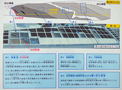中央構造線断層系「池田断層」の露頭 説明盤全景   枠1 池田断層  枠2 強破砕部  枠4 和泉層群の弱破砕部とそれを覆う段丘礫層 |